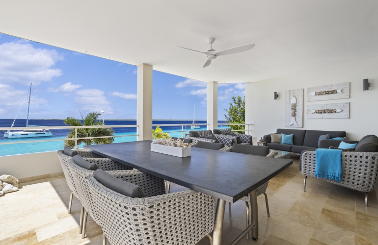 Open the wide sliding doors to spacious terrace, just off the living room and the suite fills with natural light and the ocean breeze. Here you will find an alfresco dining set and a relaxing outdoor lounge aria. Imagine gazing out over the beautiful island of “Klein Bonaire” and colorful sunsets.